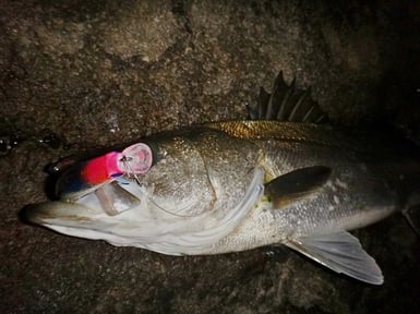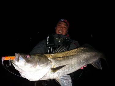 潮目に入った瞬間、ルアーがフラツキルアーを止める・・・とひったくるようなバイト!!!手前には強烈な根が存在するため・・・一気に水面を走らせるすでに、友人がサポート体制!!!