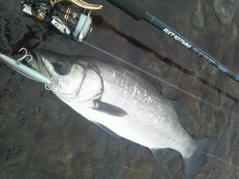 トップがダメならミノーはとサーフェスウィング120Fに交換し再度タイミングを合わせキャストすると、足元まで巻いてきたルアーのピックアップで黒い魚体が下から突き上げてきました。