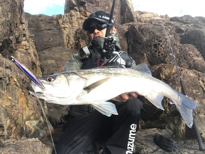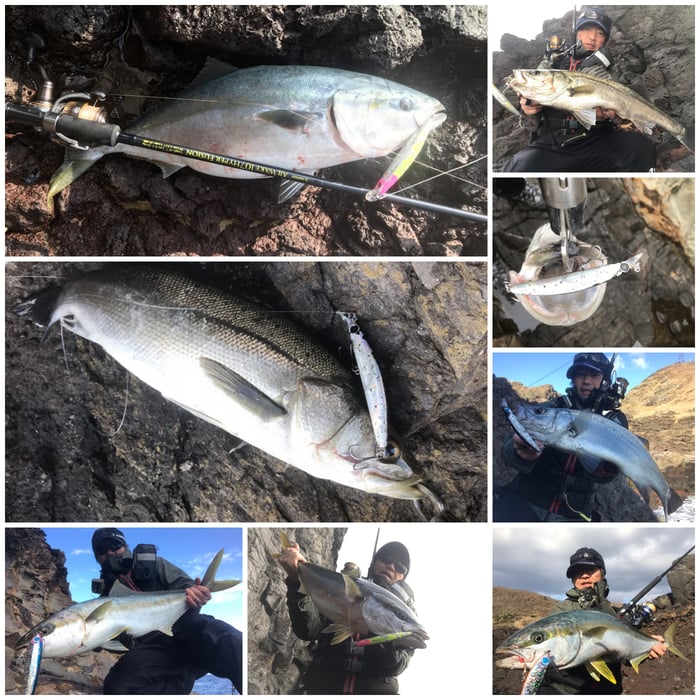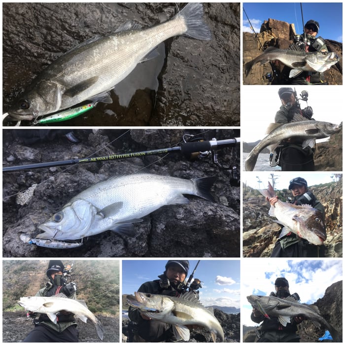 西ノ島でも難しい状況でしたが、壁ぎわに着いた魚をこれまた横からくる波にあててドリフトさせるパターンでシーバス、極太のメジロをゲットすることができました。西ノ島では107ハイパーフュージョンを使ってますが、ほんと手前のバイトも拾えるし、際どい掛かり方でもティップが吸収してくれるんでロッドに助けてもらってます。ミノーでの反応がなくなった後、一応出ないかなーとララペン165Fを通すと80クラスのヒラマサがヒット!バックアッパー98Ⅳで瞬殺しました。98Ⅳも最高な仕上がりになっています。やっぱりトップは最高ですね〜