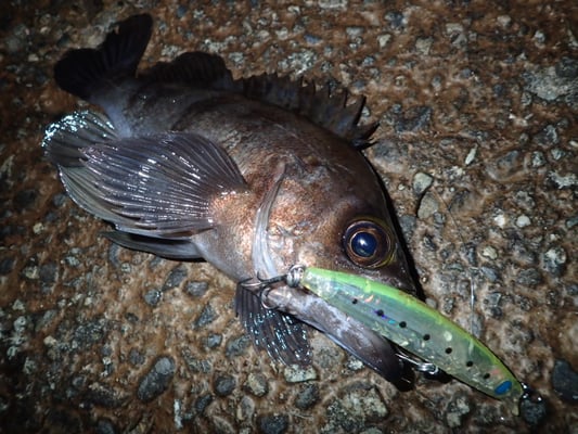 たまたま、先日釣友であるエキスパートのメバルアングラーと釣りをする機会があり、一緒に並んで釣りをしたのですが、超がつくほどの激渋な日。そんな中で唯一、シースルーイエローを食ってきたのは尺手前の良型メバルでした。