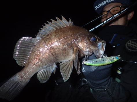 ホタルイカの姿が見えない時はアミに合わせるようにしており、特にクリアカラーが有効で、尺前後のメバルが釣れました。