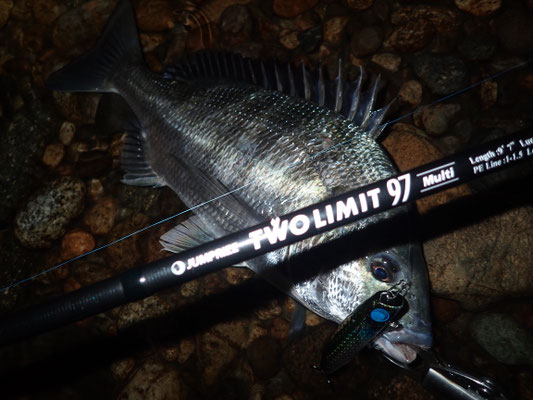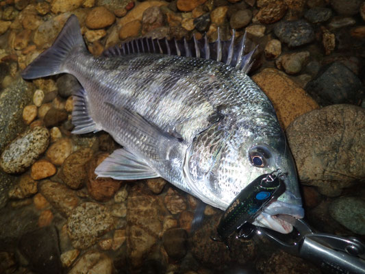 別日、更に低水位になった河川は若干鮎の数も減ったような感じ。テロテロ君75Fの緩急付けたリトリーブで銀ピカの黒鯛でした‼︎2匹ともよく引いたなぁ〜。