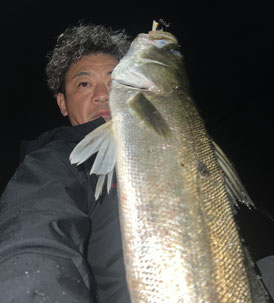 毎晩のように釣り場には行ってるんですがシーバスどころかベイトすら見当たらない状況になっています。この日も数ヶ所回って打ってみたが何も反応なく諦め車を走らせ家に向かっている道中に1ヶ所だけ潮位は無いがもしかしたらベイトが入ってるんではないかと思うポイントに行くと足下は干上がり流心だけ水があるだけで潮位も50センチあるなしの水位だったがまさかのベイトがザワザワしてる状況にテロテロ君115Fをセットし水面に出るか出ないかのウルトラデットスローで巻いてくると1投目からヒット!