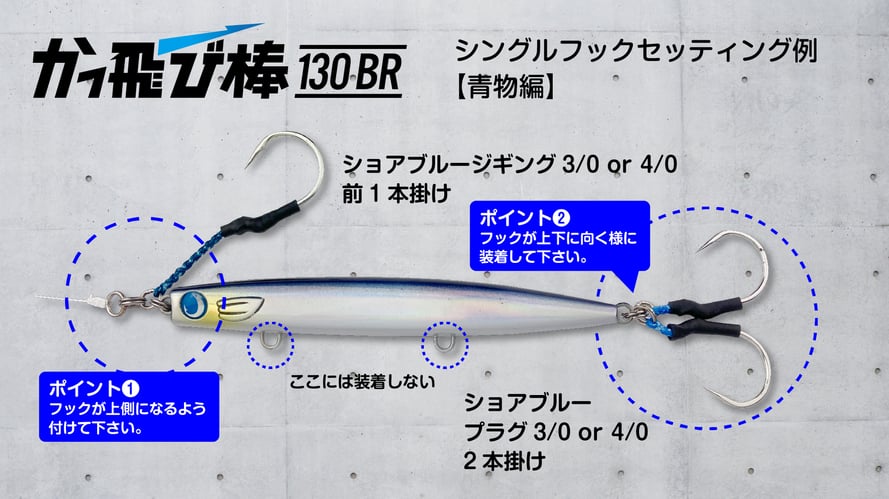 気象状況に左右されない安定感抜群の飛行姿勢。賢い外洋のフィッシュイーター達が好む弱々しいアクション。従来メタルジグでしか届かなかったスポットを130mmボディーでスローに誘えてしまう。そんな夢のようなコンセプトを実現したのが「かっとび」シリーズ。有効な使用方法はタダ巻き、ドリフト、スキッピング、ストップ&ゴー。