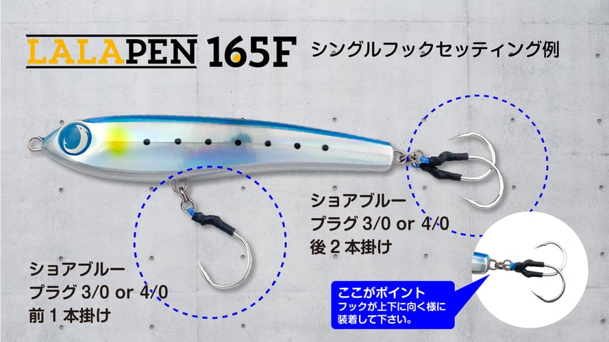 | 推奨シングル | ショアブルー プラグ 3/0、4/0(ページの下部画像参照) |