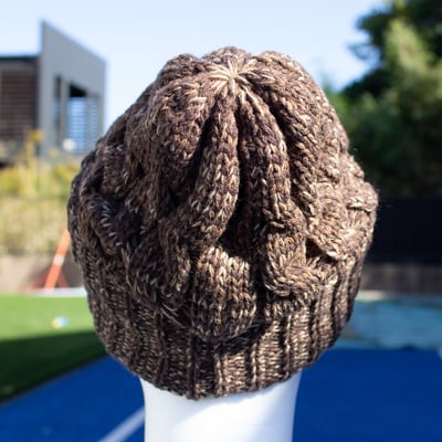 ミックス素材の毛糸で編まれた、ふんわりシルエットのアランニットキャスケットです。