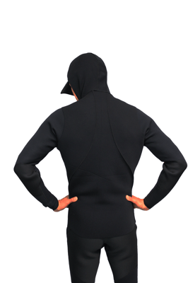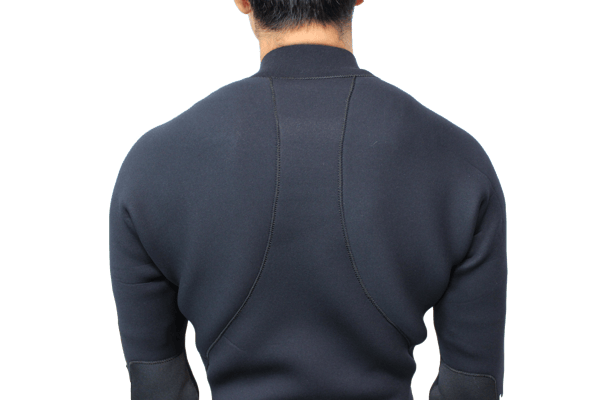 【ジャージ感覚で着られるウェットスーツ】です。通常のサイズから105~107%ほどゆとりを持たせたパターン設計により、一番酷使する肩肘胸周りは特に重点を置きゆとりを持たせています。