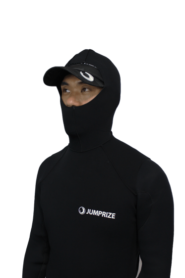 キャップの上からフードを被ることで、向かい風でも帽子が飛ばず、耳や顎、口元も暖かくなります。