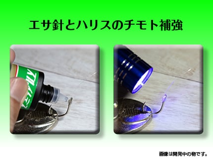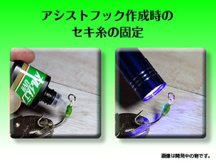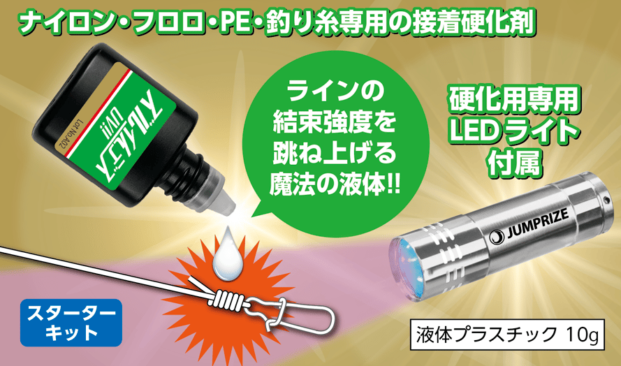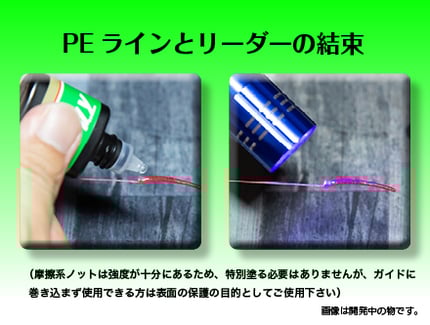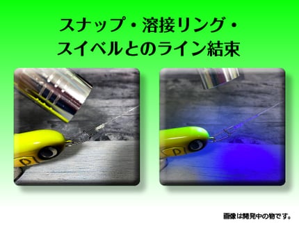 ラインの結束部分に塗り、付属の専用UV LEDライトを4秒当てれば瞬時に硬化する魔法の液体プラスチック、