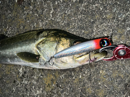 小気味よい引きで上がってきたのは小さいが初物のヒラスズキをゲット。